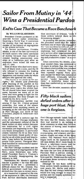In 1999, President Bill Clinton pardoned Freddie Meeks, one of the last surviving men from Port Chicago 50, but the others died without their names cleared.