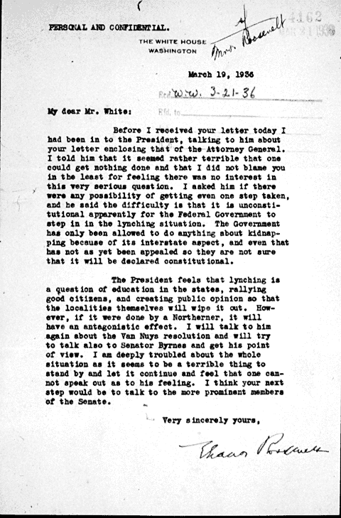 The Great Depression disproportionately affected African-Americans. Almost half were unemployed and racial violence spiked, especially lynchings in the south. President Franklin Roosevelt gave African-Americans a new hope for equality, by including black people in his cabinet, and entertaining African-American visitors at the White House.