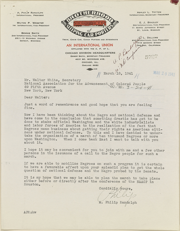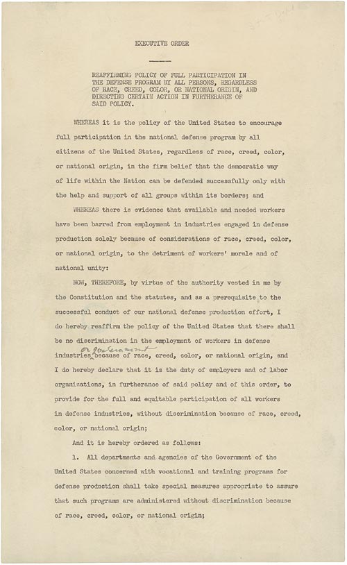 On December 8, 1941, after Japan bombed Pearl Harbor, America joined WWII in the fight against the Axis powers. African-American activist, A. Philip Randolp, threatened to organize a rally to protest segregation and discrimination in the Armed-Forces. In response, Roosevelt passed Executive Order 8802 declaring “There shall be no discrimination in the employment of workers in defense industries and in Government, because of race, creed, color, or national origin.”