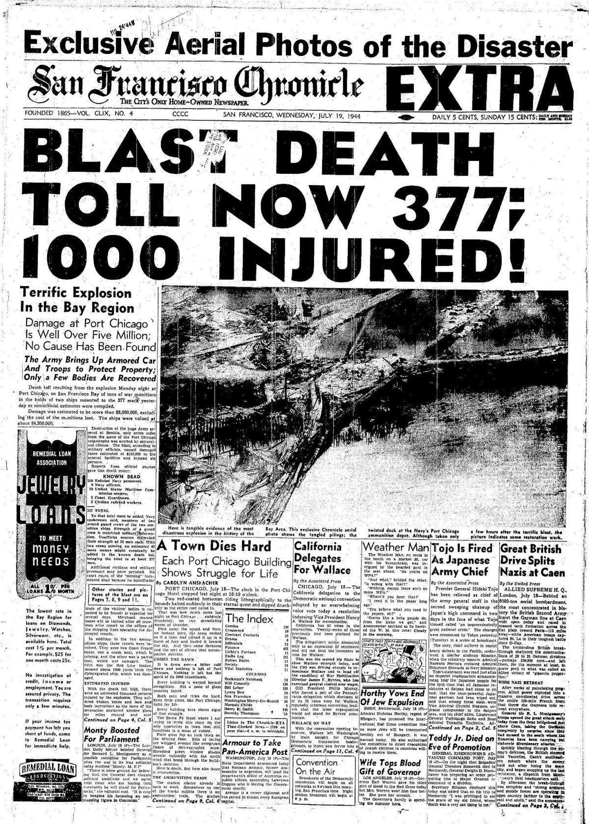 On July 17, 1944, at 10:19 PM, two tremendous explosions occurred only seconds apart, killing “375 men I think, that was reported to us who lost their lives. But it tore down the barracks that we were in. It tore them up like they were match boxes,” says Joe Small, further injuring 360, the majority of whom were African-Americans. Only 51 bodies were identified. The explosion of 5000 tons of TNT measured as a 3.4 magnitude earthquake.